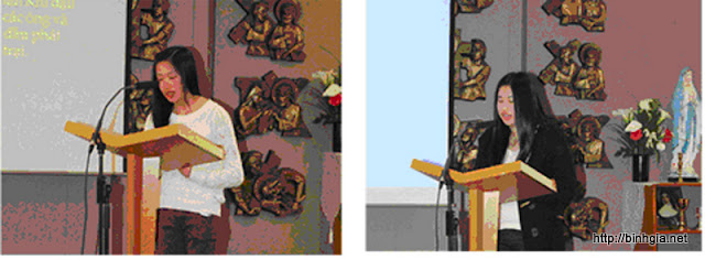 Đại diện cho giới trẻ trong Lễ Bổn Mạng hôm nay, hai cháu Kim Trang và Thiên Ân lần lượt đọc bài đọc 1 bằng tiếng Việt; và bài đọc 2 bằng tiếng Anh. Cháu Kim Trang đọc tiếng Việt không khác gì người Việt dù cháu sinh ra và lớn lên tại xứ con đại thử nầy. Không ít người trầm trồ khen ngọi… Cháu Thiên Ân đọc tiếng Anh, dù không là tiếng mẹ đẻ, nhưng rõ ràng, minh bạch, khúc chiết… làm bao người tham dự hãnh diện và sung sướng.